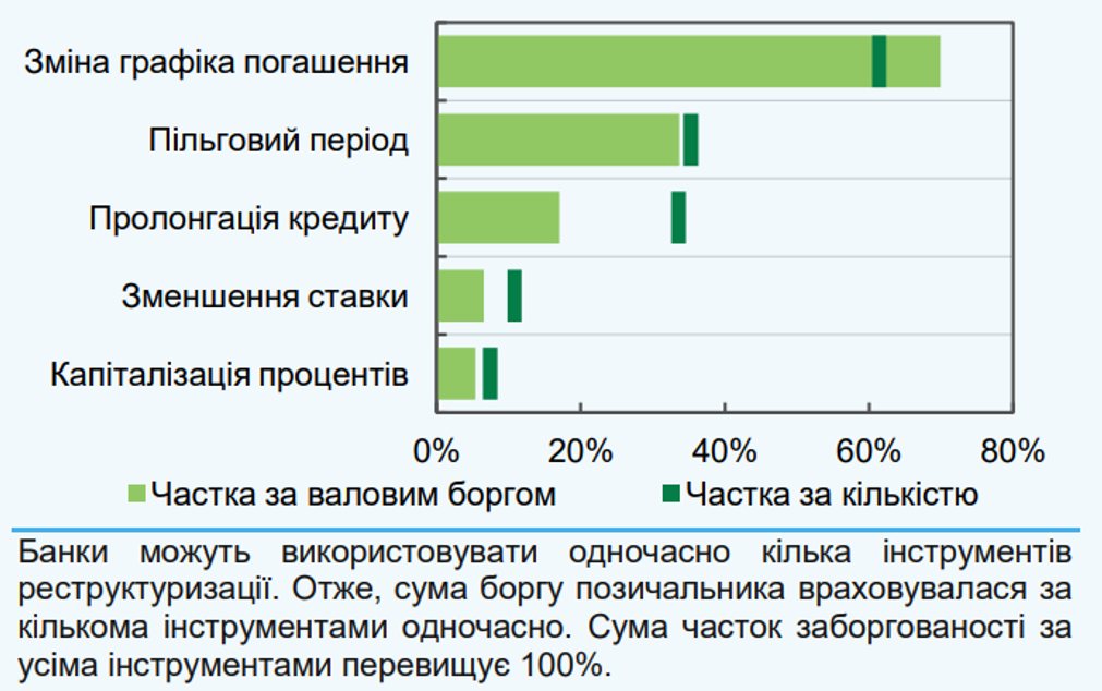 В НБУ отмечают, что банки активно работают с новыми проблемными активами, прежде всего, проводят реструктуризацию. "Военные" реструктуризации зачастую предполагают предоставление должнику кредитных каникул на 6-9 месяцев, пролонгацию кредита и изменение графика погашения. Среди всех категорий клиентов более высокие шансы восстановиться имеют испытавшие дефолт из-за финансовых сложностей или рыночных условий.