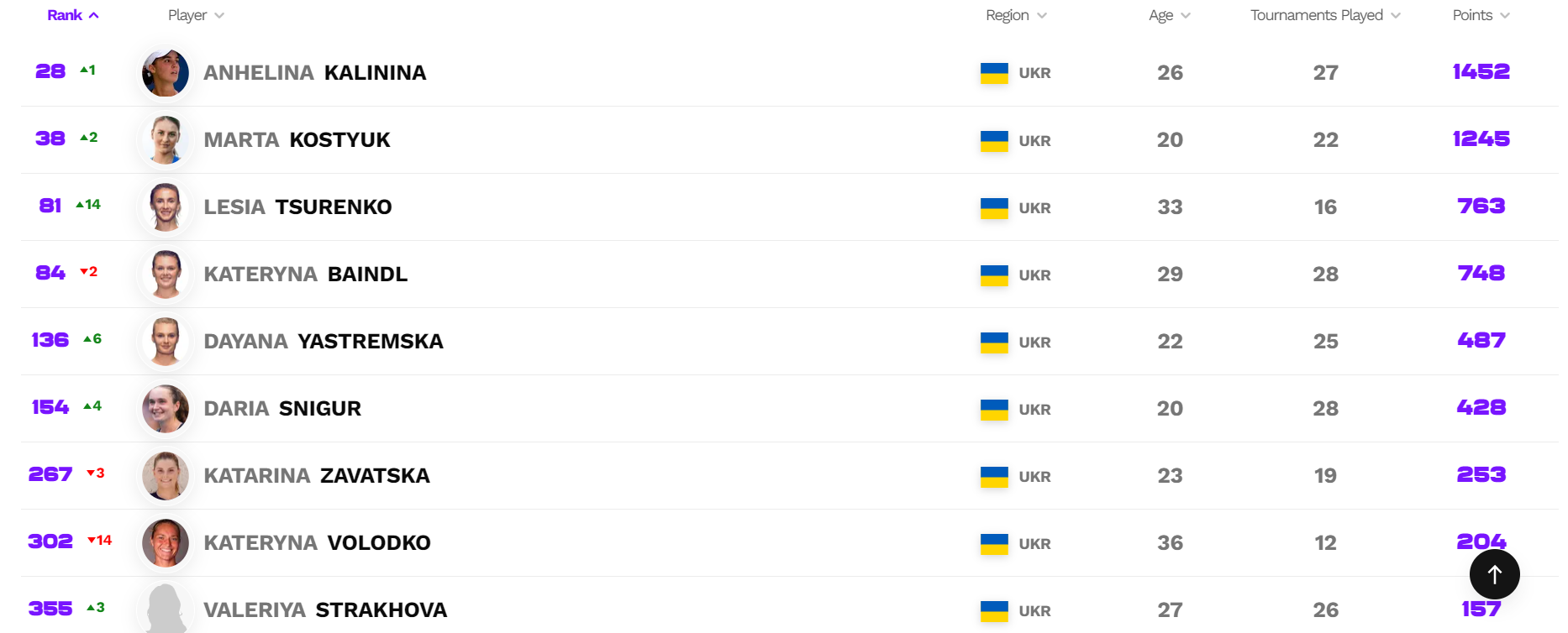 Калинина в течение недели поднялась на одну позицию. Теперь первая ракетка Украины занимает 28-е место, имея в активе 1452 рейтинговых очка. На две ступени поднялась Костюк. Молодая киевлянка набрала 1245 пунктов и теперь идет 38-й.