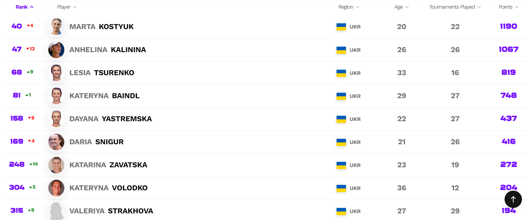 В первую сотню классификации попали еще две украинки. Опытная Леся Цуренко поднялась на 9 позиций. В данный момент она занимает 68-е место (819 очков). В то же время Екатерина Байндль идет на 81-й позиции (748). Во второй же сотне Даяна Ястремская и Дарья Снигур потеряли места.