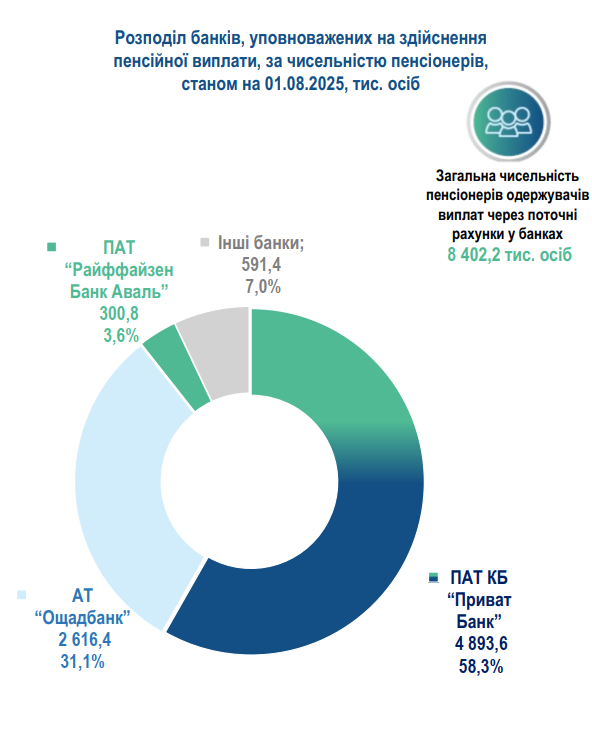 По состоянию на 1 августа 2025 года доля ПриватБанка в выплате пенсий составляет 58,3%. В этом госбанке получают деньги 4,894 млн человек. На втором месте государственный Ощадбанк (31,1%, пенсии получают 2,616 млн человек).