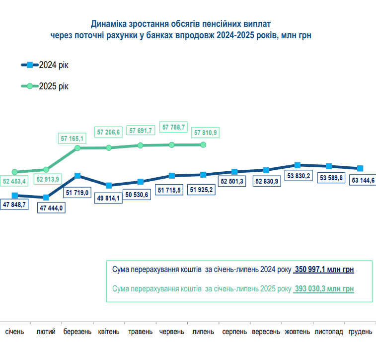 По данным ПФУ, сумма перечисления средств через банки за январь-июль 2025 года составила 393 млрд гривен, что на 12,0% больше, чем в 2024 году (351 млрд гривен).