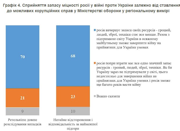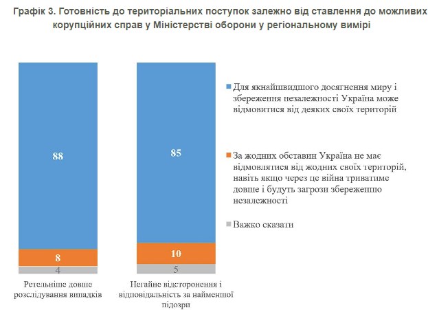 Как отмечают социологи, позиция по резонансному делу вокруг Министерства обороны не связана с "зрадофильскими" или "депрессивными" настроениями. Об этом свидетельствуют данные о готовности к территориальным уступкам в зависимости от отношения к возможным коррупционным делам в Минобороны. И среди тех, кто требует быстрых решений, и среди тех, кто хочет более тщательного расследования, абсолютное большинство против уступок агрессору.