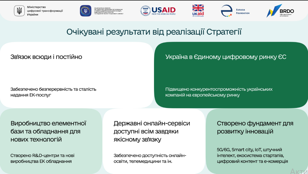 Главная цель Стратегии – обеспечить устойчивое развитие сферы электронных коммуникаций, учитывая вызовы полномасштабной войны и тенденции развития в мире. Также важное место отводится восстановлению отрасли, доступности услуг для каждого украинца и имплементации европейского законодательства.