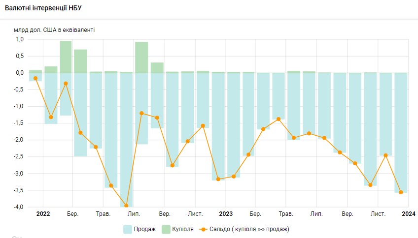 Национальный банк Украины (НБУ) в декабре 2023 года продал на межбанковском валютном рынке 3,553 млрд долларов.