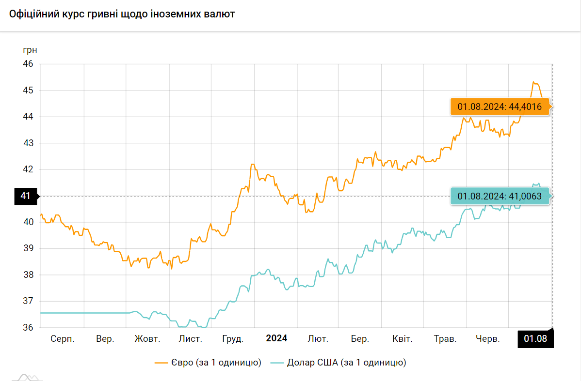 Украинская гривна закончила июль уверенным трендом на укрепление. Рост курса национальной валюты продолжается с 22 июля с отметки 41,49 за доллар и 45,19 за евро. По состоянию на последний день месяца официальный курс гривны по отношению к доллару достиг 41,03, к евро – 44,42. А на 1 августа НБУ установил официальный курс гривны 41,01 за доллар и 44,4 за евро. Укрепление за декаду составило более 1,1%.