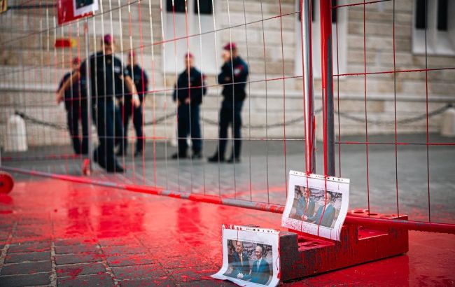 Депутаты оппозиционной парламентской фракции "Моментум" облили кроваво-красной краской забор возле офиса премьер-министра Венгрии Виктора Орбана в Будапеште.