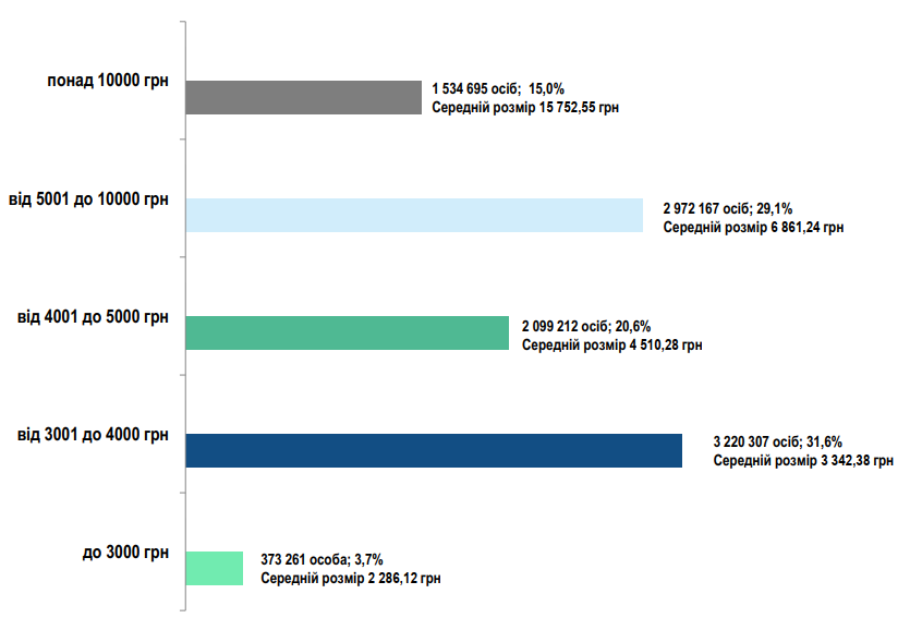 - более 10000 гривен - 15,0%, 1 534 695 человек, средняя пенсия - 15 752,55 гривен.