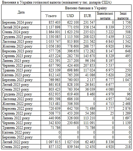 Объем наличной иностранной валюты, которую банки ввезли в Украину в марте 2024 года, составил 855 млн долларов. Это на 25% меньше, чем в феврале 1,138 млрд долларов.
