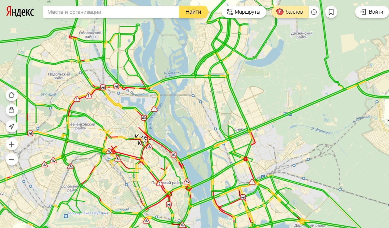 У Києві станом на 19:00 понеділка 29 серпня пробки на автомобільних дорогах досягли cеми балів. Про це свідчать дані трафік-сервісу "Яндекс.Пробки".