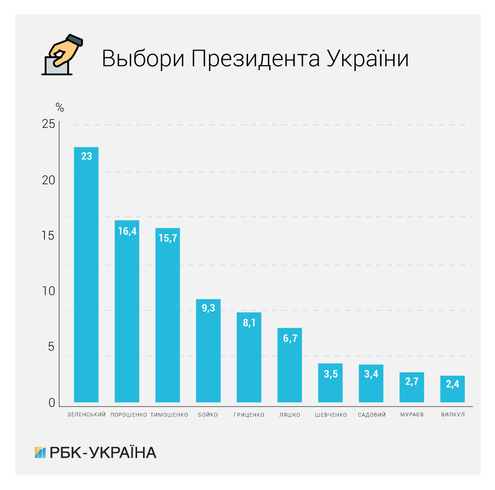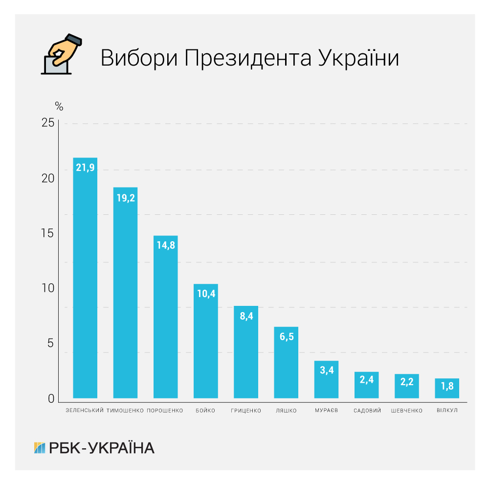 - Володимир Зеленський (33,5%) - Юлія Тимошенко (19,5%).