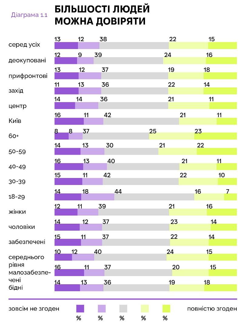 Украинцы в целом демонстрируют позитивный обобщенный уровень доверия. Тех, считает, что большинству людей можно доверять, среди респондентов 37%, не желающих доверять людям - 25%