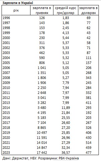 С учетом официального курса НБУ зарплаты украинцев за 2023 год выросли на 18 долларов до 477 долларов.
