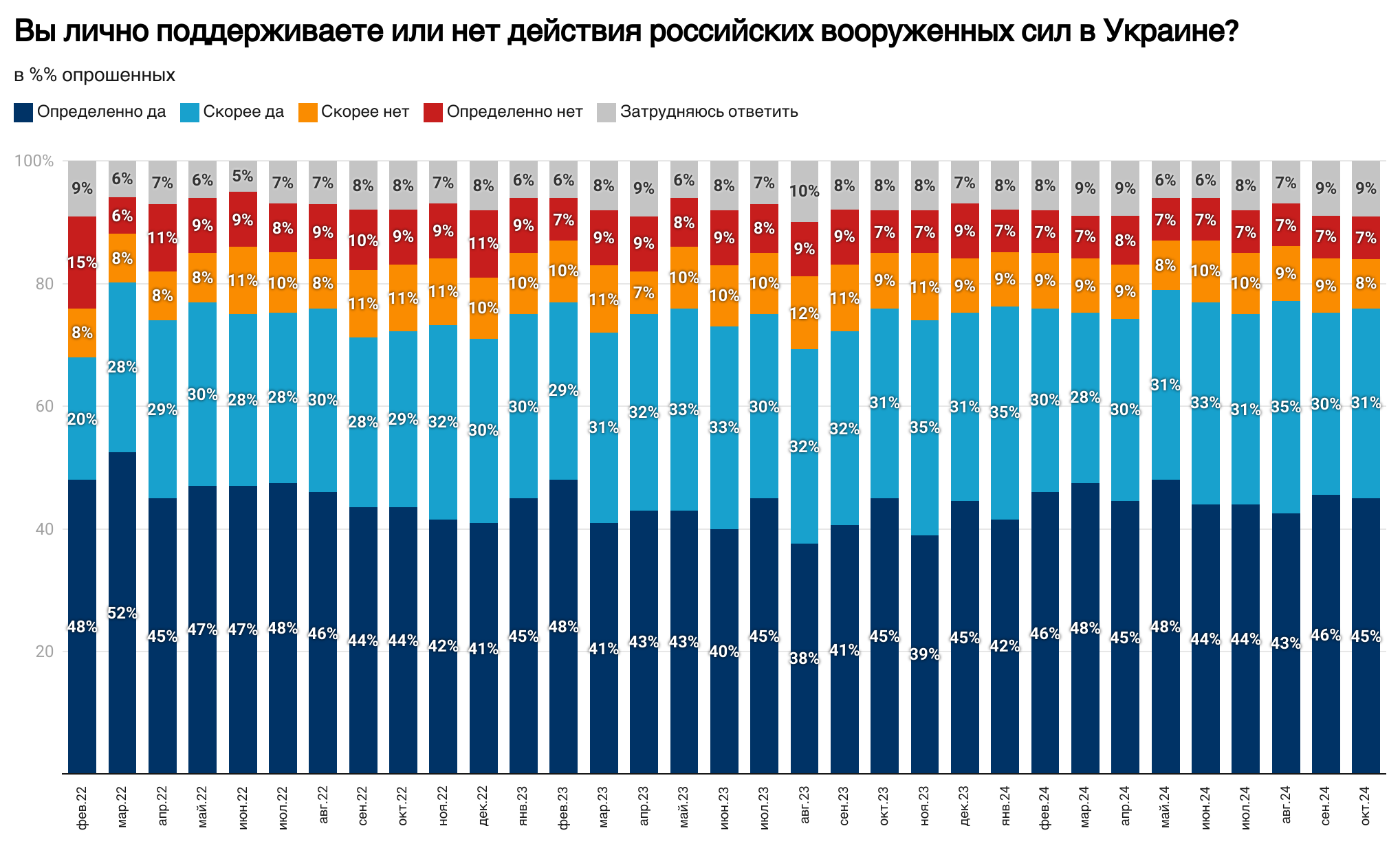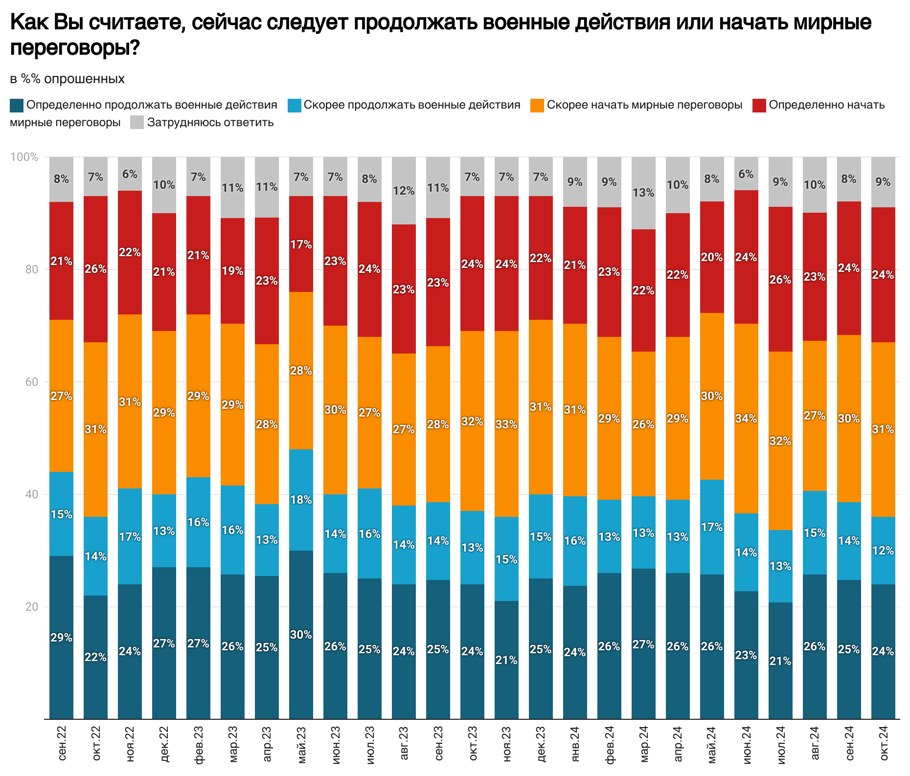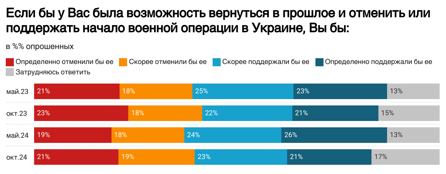 Три четверти жителей России поддерживают войну против Украины. В октябре 2024 года более половины хотят мирных переговоров, однако на своих условиях.