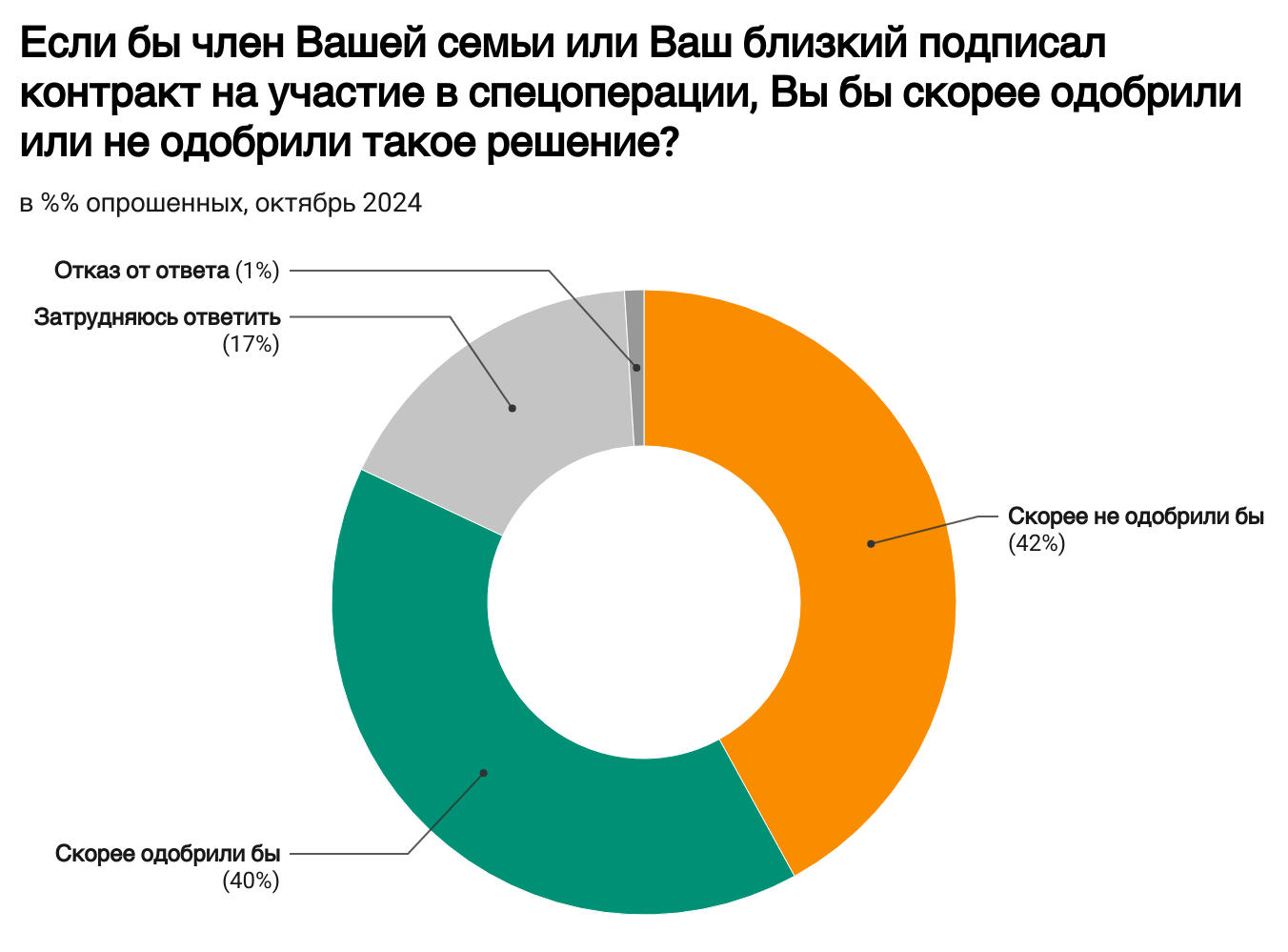 Около половины жителей России готовы отправить родственника на войну. Равные доли скорее одобрили бы (40%) и скорее не одобрили бы (42%) решение члена семьи или близкого человека, если бы он подписал контракт с военным ведомством РФ.