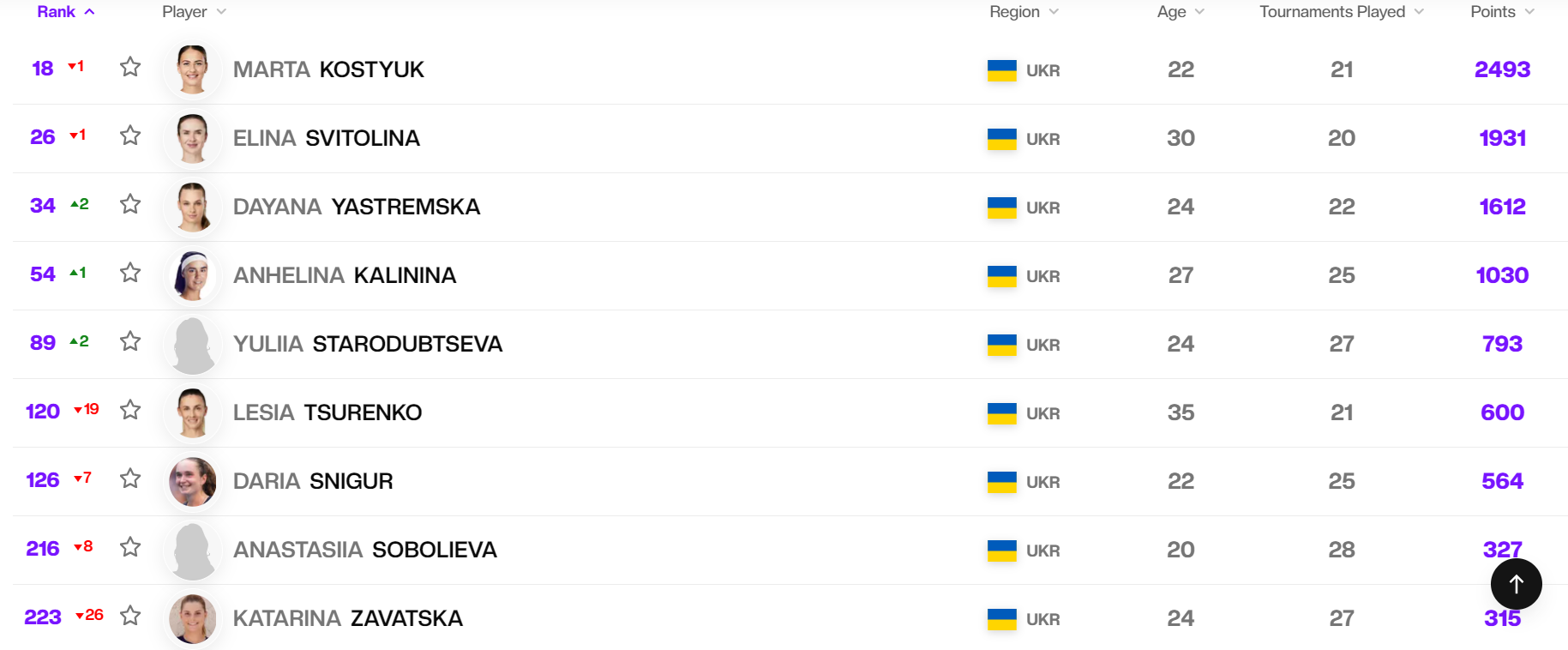 Лучшая среди украинок Костюк опустилась на одну позицию и оказалась на 18-м месте. Одну строчку потеряла и Элина Свитолина (26-я позиция). Тем временем Даяна Ястремская (34-е место) и Ангелина Калинина (54-е) немного прибавили, но все четверо спортсменок досрочно завершили сезон-2024.