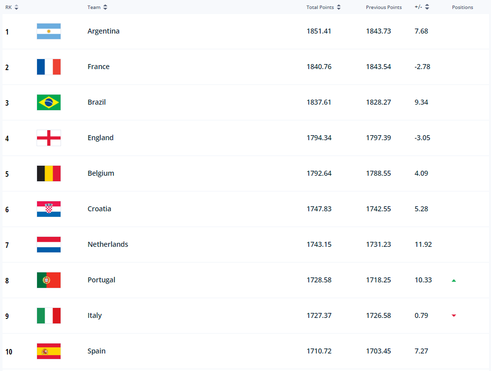 Лидером рейтинга ФИФА осталась сборная Аргентины. По-прежнему действующие чемпионы мира опережают Францию, Бразилию, Англию и Бельгию. Единственное изменение в топ-10 – сборная Португалии обошла итальянцев в борьбе за 8-е место.