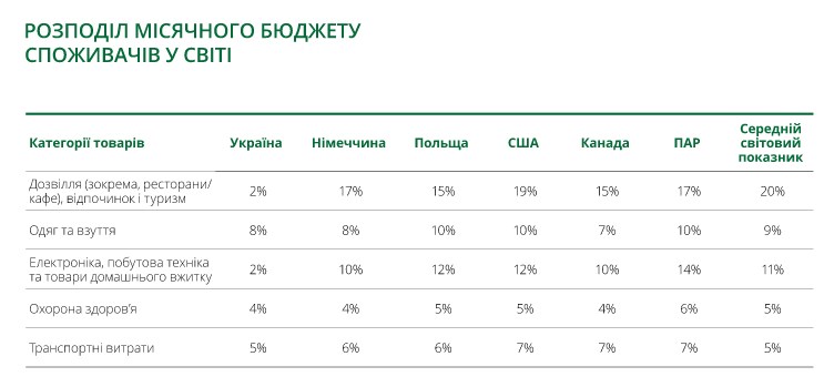 Досуг (включая рестораны/кафе), отдых и туризм: украинцы тратят 2% своего бюджета на эту категорию, в то время как жители Германии - 17%, Польши - 15%, США - 19%, Канады - 15%, ЮАР - 17%.