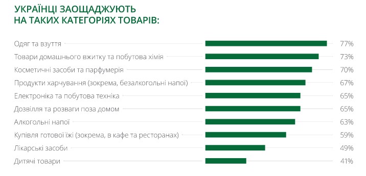 В 2023 году тенденция экономить среди украинских потребителей сохраняется. В зависимости от категории товаров экономят от 41% до 77% украинцев. Несмотря на то, что показатель все еще высок, наблюдается положительная динамика по сравнению с 2022 годом (47%-86%). Меньше всего экономят на лекарственных средствах, детских товарах и покупке готовой пищи.