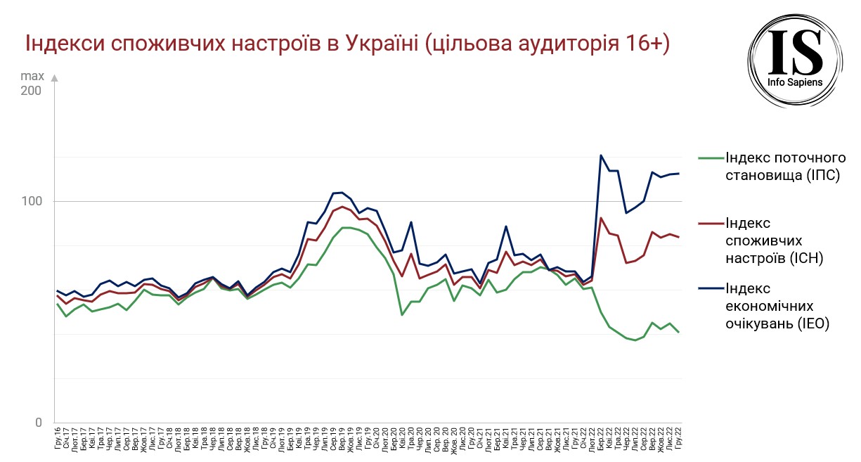 Как отмечают аналитики Info Sapien, в 2022 году Индекс потребительских настроений выше по сравнению с предыдущим годом, во многом из-за аномальной ситуации, вызванной войной, хотя и остается в отрицательных значениях (менее 100). С начала полномасштабного вторжения индексы текущего и экономических ожиданий, исторически имевших близкие значения, впервые разделились: население более выражено и уверенно ждет лучшего будущего параллельно с пониженной оценкой текущего положения.
