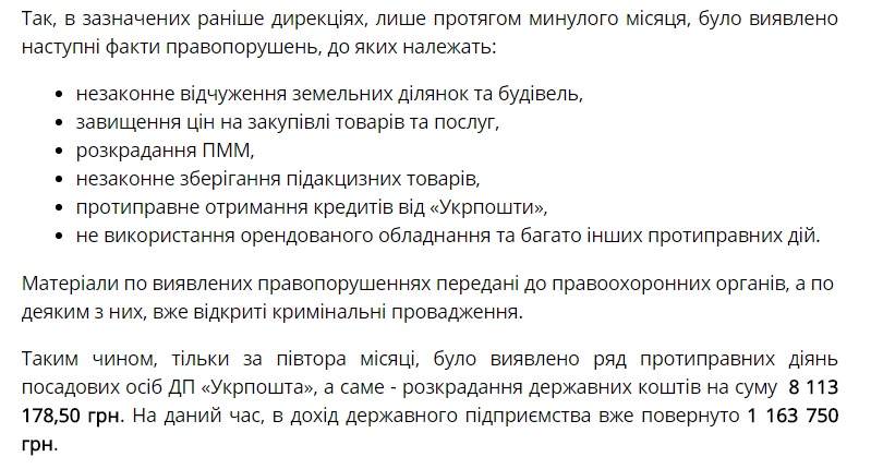 "Тільки за півтора місяці було виявлено ряд протиправних дій посадових осіб ДП "Укрпошта", а саме - розкрадання державних коштів на суму 8113 178,50 грн. В даний час у дохід державного підприємства вже повернуто 1163750 грн", - додав Лавренюк.