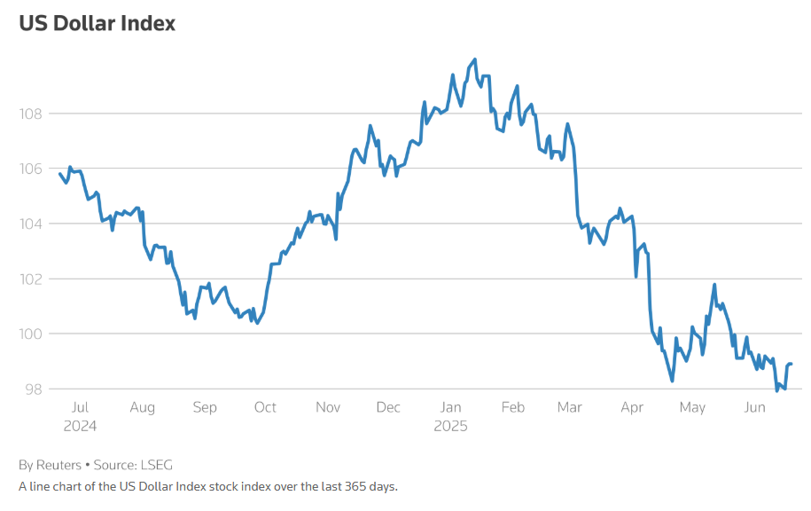 Индекс доллара, сравнивающий американскую валюту с шестью другими, вырос 20 июня на 0,5% за неделю. Боевые действия между Израилем и Ираном продолжаются уже неделю, и рынки обеспокоены вероятным вмешательством США.