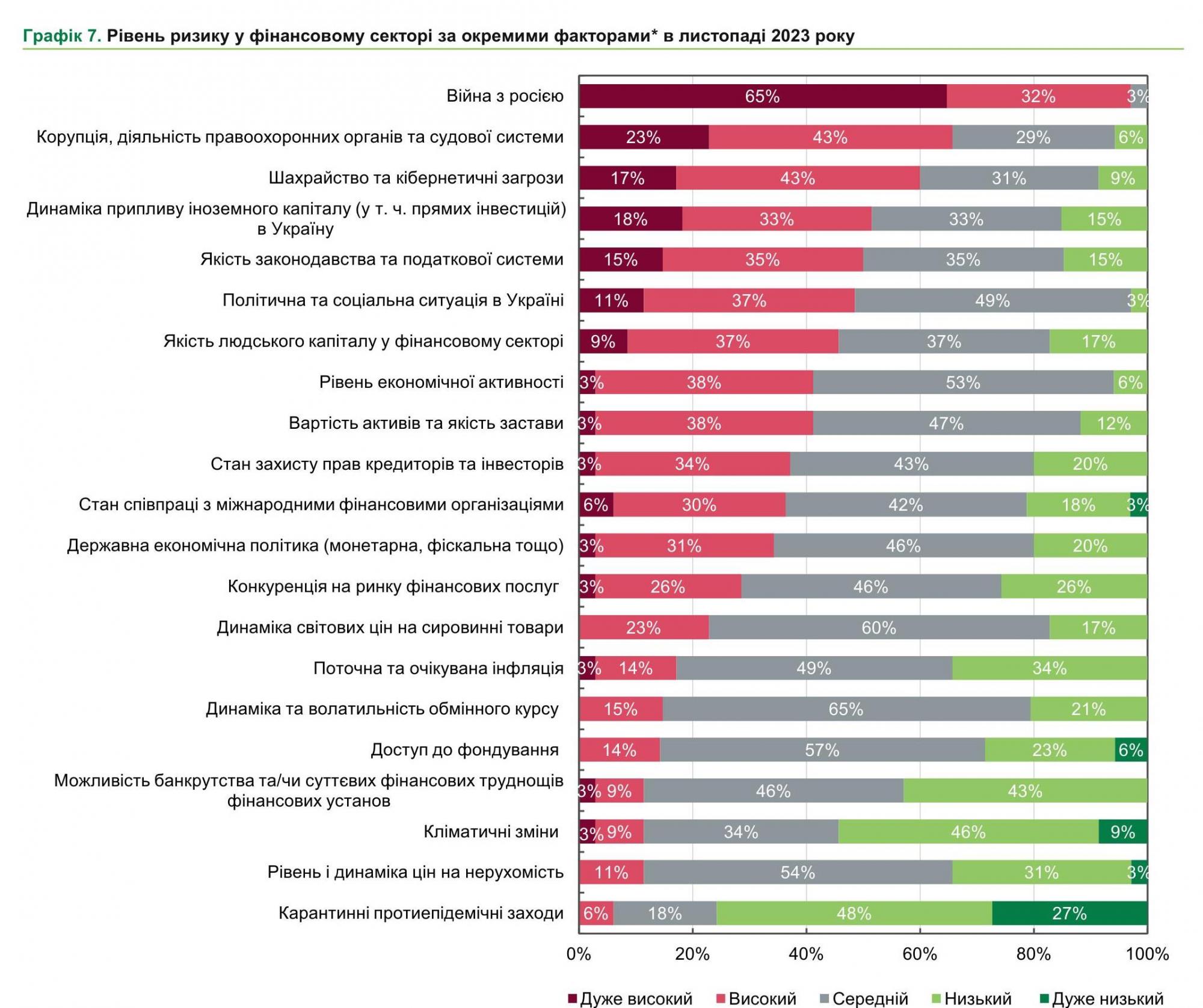 Опрос топ-менеджеров финансовых учреждений в ноябре 2023 года свидетельствует, что основной источник рисков в финансовом секторе не изменился - это война с Россией. На втором месте осталась коррупция.