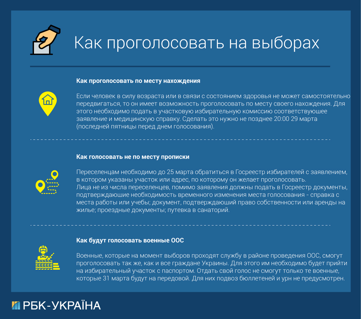 Якщо людина в силу віку або у зв'язку зі станом здоров'я не може самостійно пересуватися, то він має можливість проголосувати за місцем свого знаходження. Для цього необхідно подати заяву в дільничну виборчу комісію відповідну заяву і медичну довідку. Зробити це потрібно не пізніше 20:00 29 березня (останньої п'ятниці перед днем голосування).