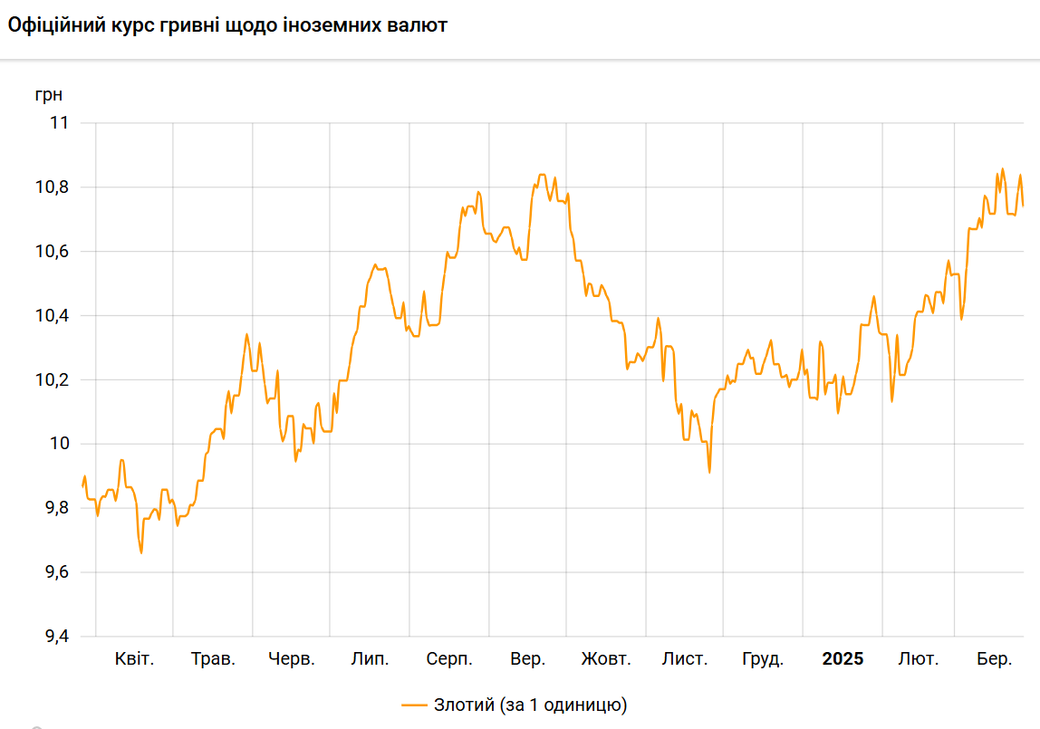 Официальный курс на 27 марта 2025 года установлен на таком уровне: 10,7399 гривен за 1 злотый (-0,1012 грн).