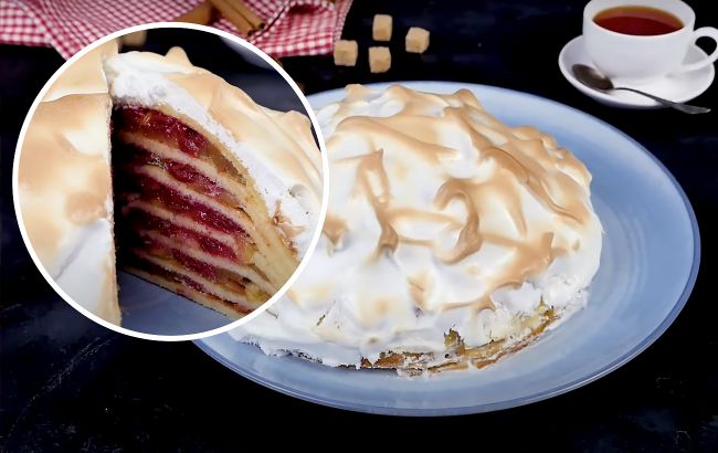 Остается сложить соложеник: положите блинчик на застеленный фольгой противень и смажьте его белковой массой. Сверху выложите слой яблок и вишни. Накройте другим блином. И так чередуйте до конца.