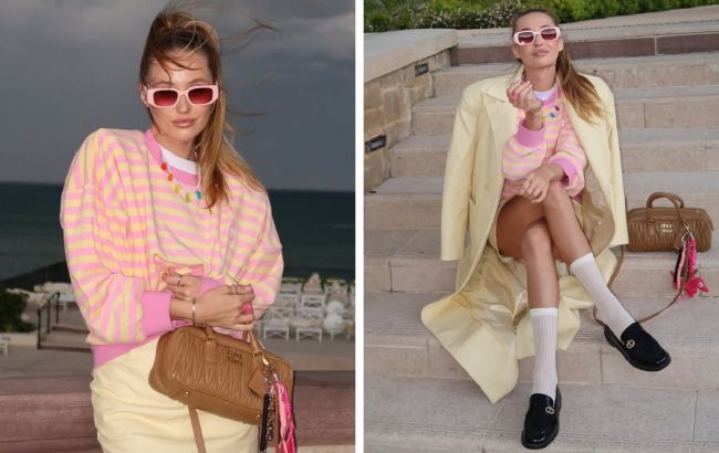 Блогерша показала образ в розово-желтых оттенка. Она надела короткую юбку мини лимонного оттенка, белую футболку и свитер в розово-желтую полоску. Дополнить его она решила очками с розовой оправой и разноцветным ожерельем. Также она надела высокие белые носки и классические черные лоферы.